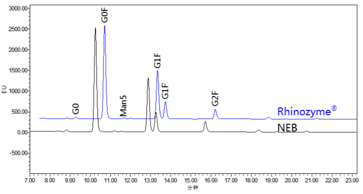 利用 Rhinogen PNGase F(Glycerol-free)進(jìn)行糖蛋白去糖基化后,會(huì)釋放出完整的寡糖鏈,并在釋放糖鏈的同時(shí)將氨基酸特征序列上的天冬酰胺殘基轉(zhuǎn)化為天冬氨酸殘基。 |